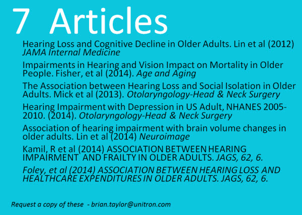 Figure 6 lists seven articles from peer-reviewed medical literature showing a relationship between age-related hearing loss and other chronic conditions and comorbidities. If you wanted to build a strong relationship with physicians, a straightforward way would be to know the basics of the science behind these articles and be able to talk about it intelligently with any physician or nurse. If you want access to these articles, please email me. Unitron has developed Better Hearing is Better Living flyers also that you can use in the education process. These are available upon request.