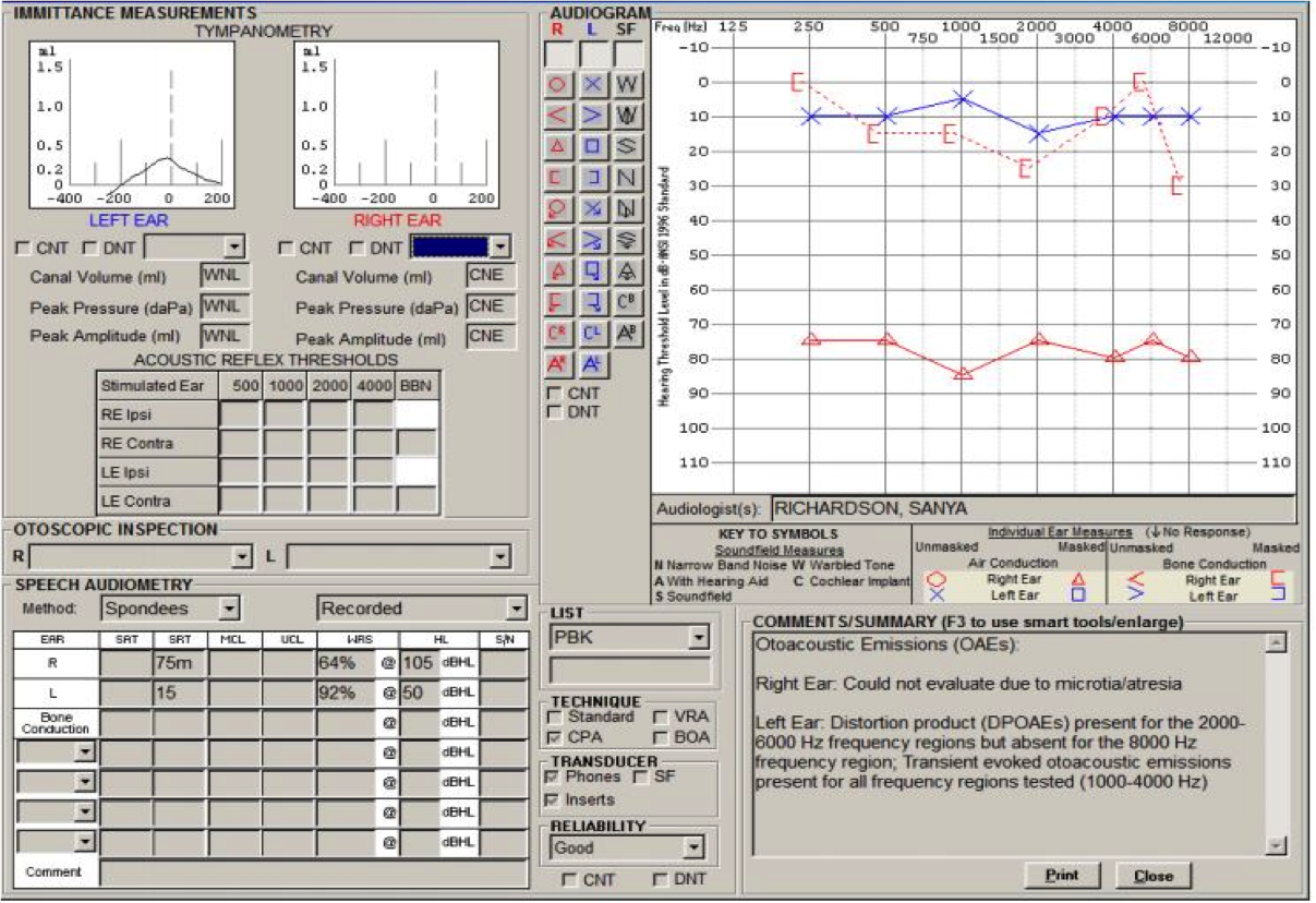 Here is my daughter's latest hearing test (Figure 1). As you can see, she has a severe hearing loss in her right ear; however, when aided with the Oticon Medical Ponto Plus, her hearing is restored within normal hearing range. After reading all of the research that I have found about UHL, about the critical years of development and discovering how a child with right ear hearing loss can be impacted more than someone with left ear hearing loss, it surprises me that others think there's not enough evidence or information to support being able to aid a child who has unilateral hearing loss with a bone-anchored hearing device.