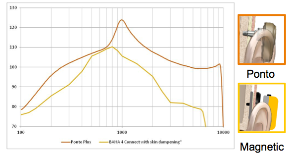 When a bone-anchored device is attached to a soft band headband, and it's compared to a bone-anchored device directly on an abutment, there can be as much as a 10 to 20 dB attenuation of sound in the mid to high frequency range. Figure 2 shows the output of a Ponto Plus device on an abutment (direct drive approach) and the output of a magnet device (skin drive approach). The direct bone conduction on an abutment provides significantly more output than the skin drive approach, both in the lower frequencies and in the mid and high frequency ranges. Remember, increased low frequencies help to provide better loudness sensation and voice quality and the high frequency range is important for speech perception, sound quality and understanding in noise.