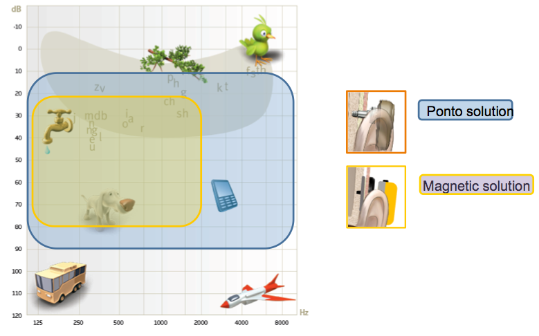 Figure 3. Audiogram with speech banana showing audible range for Ponto solution (blue) versus a magnetic solution (yellow).