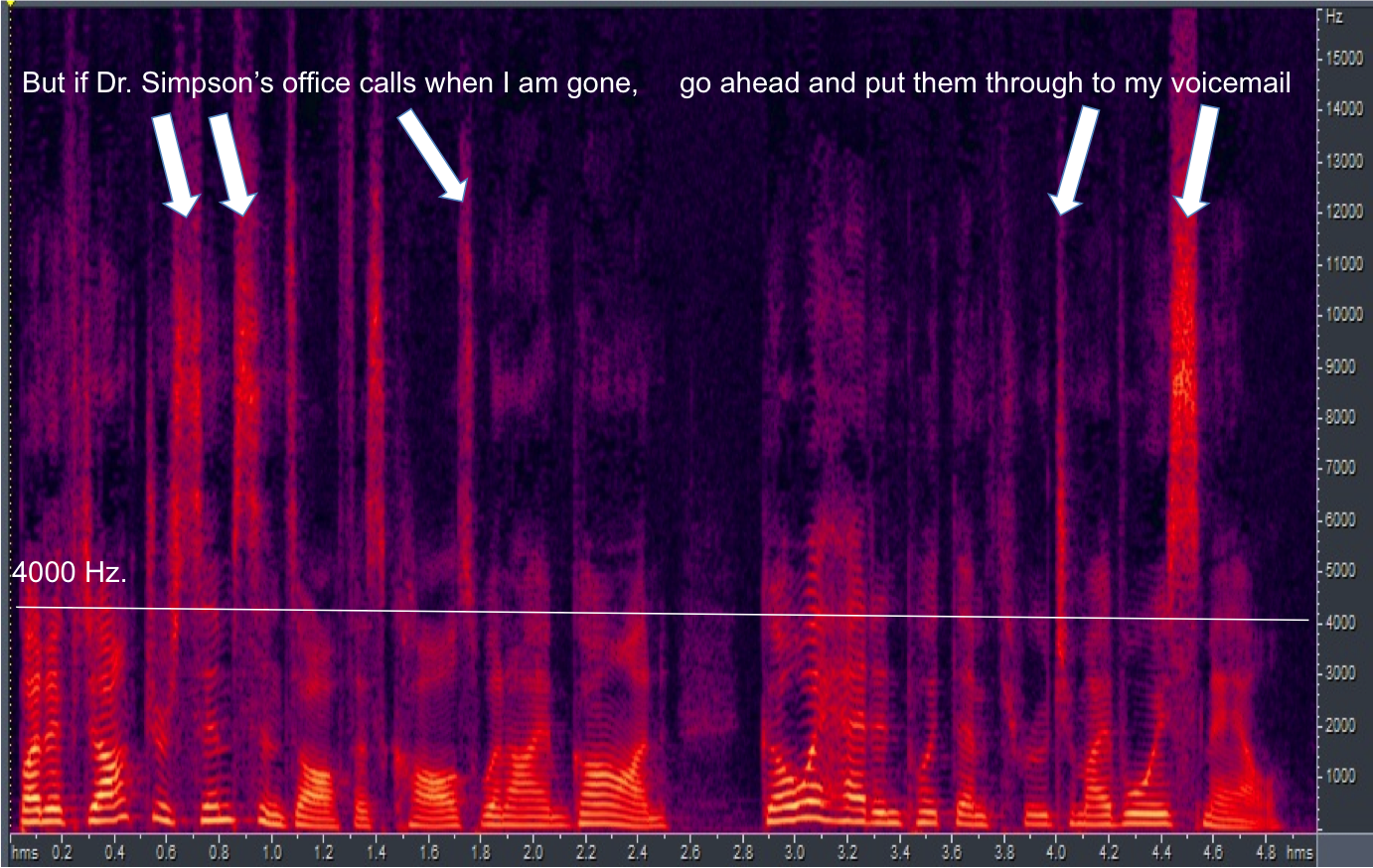 You see significant energy above 4000 Hz. Every time you see this energy above 4000 Hz, there is usually a hole in the spectrum below 4000 Hz. In other words, if you are going to create intense high frequency sounds, typically you are doing it in an unvoiced way. When you do it in an unvoiced way, there is room in the spectrum in the mid frequencies because, at that moment in time, nothing much is happening there. By using a frequency lowering approach that copies this information and replicates it in the mid frequencies, we are not challenging the auditory system too much.