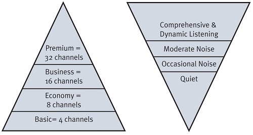 Currently, most differentiation across practices and tiering of value is done almost exclusively with the device itself. Since the beginning of the digital signal processing era nearly 20 years ago, differentiation has been based on number of channels of wide dynamic range compression (WDRC). Not only is differentiation across technology based on channels lacking sufficient evidence (no more than 8 to 16 are needed to optimize audibility and sound quality), it ignores several other attributes that patients may value. Figure 1 contrasts two different ways of thinking about product value. The pyramid on the left represents the traditional tiering of technology using channels of WDRC, while the pyramid on the right depicts a more comprehensive method, incorporating other attributes that hearing-impaired customers and their families are more likely to value, such as listening in ever-changing, dynamic environments.