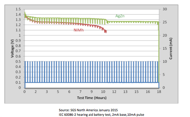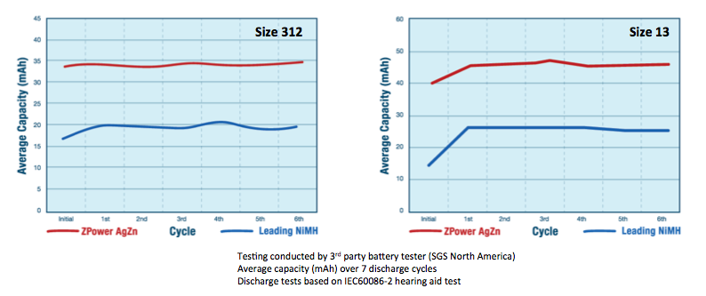 The following tests were conducted by a company called SGS. They are the world’s leading inspection, verification, testing and certification company. When testing the performance of ZPower’s silver zinc technology versus the Nickel-Metal Hydride (the kind used in Siemens/Signia chargers), they found that ZPower’s silver zinc did in fact have twice the battery capacity (Figure 2).