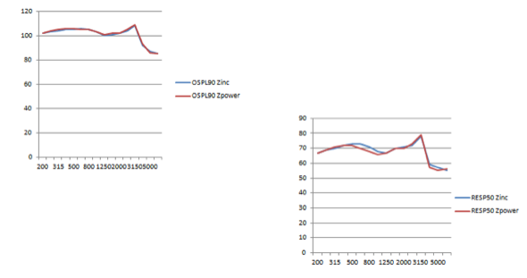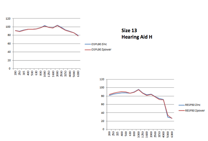 Dr. Catherine Palmer from the University of Pittsburgh conducted electroacoustic testing for us. One of the main requirements was that there could not be a problem with the electroacoustic output of the hearing aid when using the ZPower AgZn battery. As expected, we saw excellent results. Dr. Palmer tested hearing aids from all of the big six hearing aid manufacturers. The following two graphs (Figures 4 and 5) show the output of top hearing aids when using both silver zinc size 312 and also size 13 batteries (red lines) as compared to traditional 312 and 13 zinc air batteries (blue lines). As you can see, the results are the same. Acoustically, there is no difference.