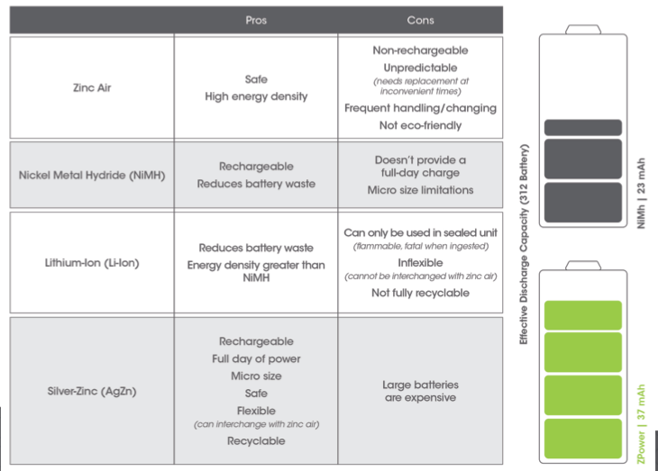 Li-Ion has a high energy density in high voltage. It's relatively inexpensive, however, one drawback is the safety concerns associated with it. Think of e-cigarettes and hover boards – those are products that use lithium ion batteries. Li-Ion tends to get hot and laptop batteries have even been known to catch fire. How many times has your cellphone gotten warm just from using it? It's not something we would necessarily want in a hearing aid next to our patients’ heads. In order to keep Li-ion batteries safe and non-flammable, additional circuitry has to be added to the hearing aid. This increases the cost and the size of the hearing aid. The biggest downfall is that the patient is not able to interchange a zinc air battery if necessary. In situations where there is a power outage, if you are on vacation, or simply that your hearing aid just doesn’t work - a patient with a Li-Ion powered hearing aid simply has no backup option.