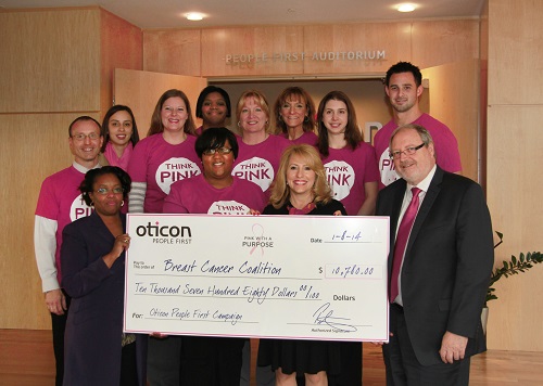 Oticon President Peer Lauritsen presents a check for $10,780 to Daniell Griffin, Director of Development at National Breast Cancer Coalition. The check represents the proceeds from the Oticon Pink with a Purpose campaign.