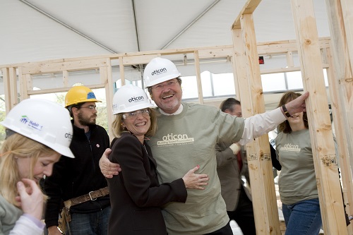 Oticon President Peer Lauritsen is joined by volunteers for a wall-raising challenge for a Habitat for Humanity home donated by Oticon and constructed during the 2008 AudiologyNOW! conference in Charlotte.
