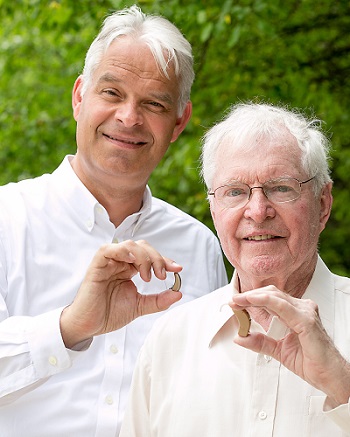 Unitron President Jan Metzdorff holding Moxi Kiss RIC (left) with Unitron founding partner Rolf Dohmer holding a 205A BTE from 1966 (right).
