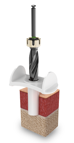 The full drilling procedure is performed through the cannula which protects the soft tissue and holds the cooling fluid during drilling. The new drills are designed for more efficient drilling with a twist drill design that helps remove bone chips from the drilled hole and also allows cooling fluid to reach the bone2. The implant insertion is guided by the insertion indicator that supports the operator in judging when the implant is fully seated. Finally, the new soft healing cap is fitted to stay in place during the short healing period.