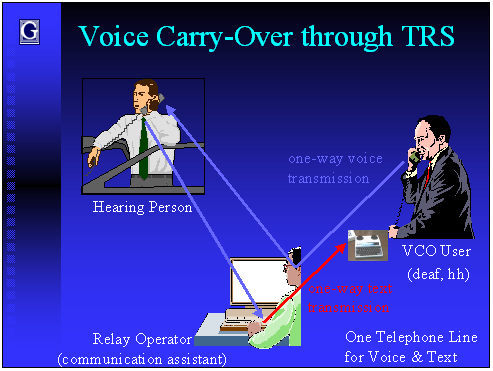 Auditory plus Visual Systems: If an individual prefers to use his own voice rather than type on a TTY, he can still use the TRS for voice carry over service. Voice carry over (VCO) allows users to read what the other person says on a TTY and talk for themselves over the telephone. The VCO user calls the relay service, and tells the relay operator he wants to make a VCO call. The operator then calls the other party. The VCO user will speak for himself, and the other person will hear the VCO user's voice. When the other person speaks, the operator will type what that person says, and the VCO user will read what was said on the display window of their TTY or VCO phone.