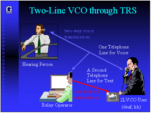 In other TRS calls using text-to-voice or voice carry over, only one person can "speak" at a time. With Two-Line VCO (2LVCO), both parties can hear each other and talk whenever they want, permitting simultaneous, two-way voice communication and a more natural conversational experience for both parties (Wyant, 1999). This is accomplished by using two phone lines. One telephone line is for voice communication. A second telephone line is for text transmission. The voice line must have a 3-way calling feature so the relay operator can listen to the conversation and type what the hearing person says for the 2LVCO user. This means the 2LVCO user will be able to both hear and read what the other person has said. Even so, the text and speech will not occur simultaneously. The text will lag behind the speech because of the time required by the operator to type what the hearing person has said.
