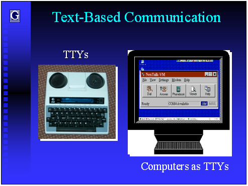 Visual Systems: Visual, text-based access to the telephone has traditionally been through the TTY (Slager, 1995). TTY's are terminals used for two-way text conversation over a telephone line.