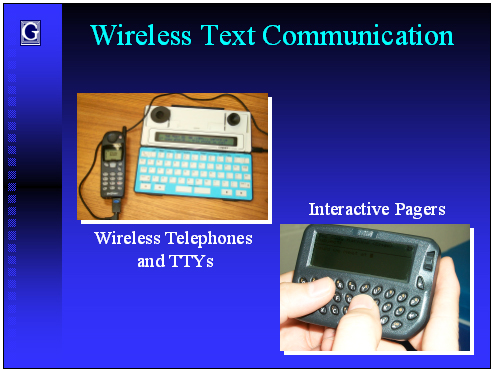 Just like wireless voice communication, wireless text communication is becoming very popular in the deaf community. There are two ways to achieve mobility for text communication. One way involves connecting a wireless telephone to a small, portable TTY. However, wireless telephones do not couple well acoustically to TTYs. They require special cable adapters as well as an audio jack on the TTY to transmit the required communication code used between TTYs. Like hearing aids, they can also experience their own type of interference when used with digital wireless cell phones such that the transmitted text becomes garbled. The FCC has ordered the wireless telephone industry to be compatible with TTY by June of this year (Harkins, 2000). Nevertheless, a wireless telephone connected to a TTY does not afford its user the same degree of portability and convenience a wireless phone user experiences.