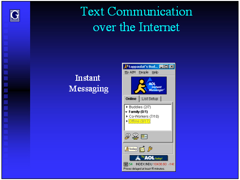Probably the most familiar form of text communication over the Internet is email. As useful as email has become, it does not afford its user the ability to have real-time, two-way communication, nor does the user know if the person being sent the email is actually on-line to receive it and respond. Instant messaging (IM) is capable of both of these functions. IM users are automatically informed regarding who is on-line, and who is available for text chat. This capability is accomplished through a "buddy" list, and is referred to as "presence." IM users must be using the same (or compatible) instant messaging system to communicate with one another. Other functions, like file transfers, are incorporated into most IM software, which in many cases can be obtained from a website and used free of charge.