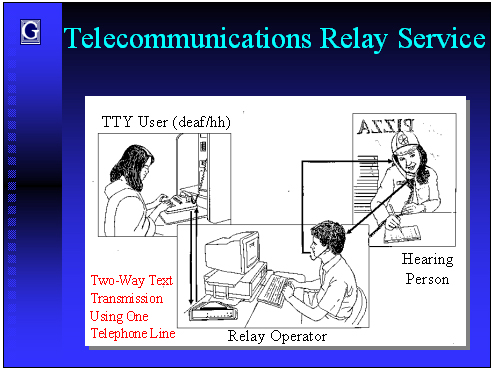 The Telecommunications Relay Service (TRS) provides a protocol for a hearing person with a voice telephone and a TTY user to communicate via a regular telephone line. The call between the two parties goes through a relay operator, also called a communication assistant. The operator types to the TTY user for the voice caller and voices to the hearing person for the TTY user. TRS is mandated nationwide and provided 7 days a week, 24 hours a day, without additional cost to either caller. To reach relay services anywhere in the country, just dial 711. There are a number of different types of TRS. The type of TRS described above is called Text-to-Voice TRS. All text forms of TRS are currently carried over standard phone lines, but Internet-based TRS is being considered. MCI Worldcom has implemented a trial text-to-voice Internet relay service on their website. Individuals with hearing loss may also want to try another form of TRS, Voice Carry Over or Video Relay Services, depending on their communication preferences.