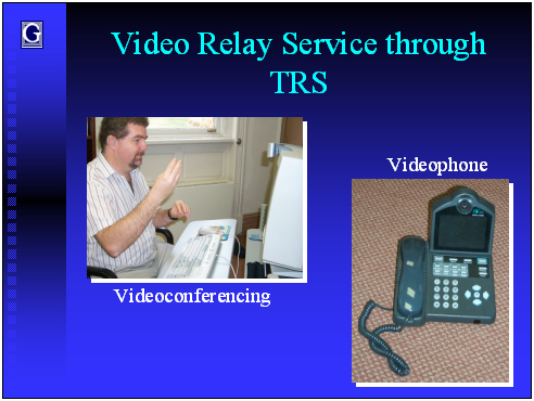 Video relay service (VRS), a new type of relay service, was authorized by the FCC last year. Video relay service allows for sign language interpretation, rather than typing on a TTY, for relaying the speech of the hearing party. The caller uses a videoconferencing or videophone product that works with ISDN, a digital telephone service. ISDN stands for Integrated Services Digital Network and can use the same telephone wires as standard wireline service for single line use. The ISDN line is neccessary to achieve adequate video quality for sign language communication. Using an ISDN line, the VSR user contacts a video relay station where sign language interpreters are present. The interpreter places a call to the other party on a regular telephone line, and interprets the phone call in both directions. While video relay service is currently used for sign language interpreting, there is no reason why the same service could not be implemented for an oral interpreting application.
