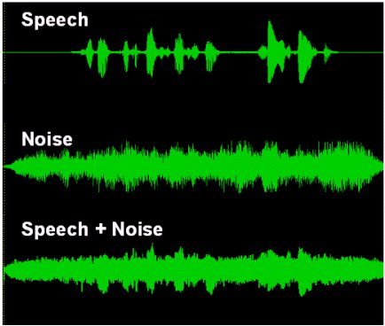 Figure 1: Speech in quiet, cafeteria noise, and speech imbedded in cafeteria noise at +5 dB S/N. The deep modulations of speech in quiet are lost when imbedded in noise even though speech is still present. Modulation detection systems will likely recognize this mixed signal as noise.