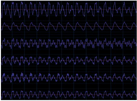Figure 2: The waveform of a section of the vowel /o/ presented unfiltered (upper panel) and filtered in the following bands: 1-250 Hz. (panel 2), 1500-2500 Hz. (panel 3), 2500-3500 Hz. (panel 4), 3500-4500 Hz. (panel 5), and 4500-5500 Hz. (panel 6). Notice how the energy pattern is precisely locked in time across the high frequency bands and is driven by the fundamental frequency (panel 2).