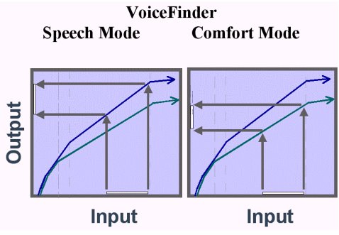 Wearing a hearing aid all day long is often described by users as being annoying and fatiguing (Schum, 2001). It is not hard to understand why. Due to the threshold loss, patients need to constantly listen to sound at elevated levels in order to receive whatever speech information is available. Even though the sound may be limited below the listeners Uncomfortable Loudness Level, the overall dose of sound throughout the day provides overall stimulation that is likely to be simply tiring. The Voicefinder system is designed to reduce the overall amount of stimulation throughout the course of the day by shifting into the Comfort Mode (see Fig. 3) when speech is not present (which is a surprisingly significant proportion of the day for many people).