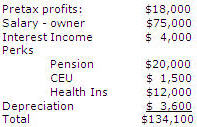 Practice value = (Pre-tax profits + owner's salary + add backs from perks + interest income + depreciation) - (allowance for capital expenses)