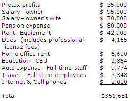 Add backs to net profit are those expenses that would not ordinarily be incurred by the new owner. For many small practices, the owners take certain "perks" to offset taxable income. For example, a generous automobile allowance, salaries to family members who are not fully employed in the practice, and the owner's higher-than-usual salary are some examples of expenses that result in a lower net profit. As will be discussed later, taking the net profit and multiplying it by a variable often determines the value of a practice. In the case of a practice where add backs drain a high percentage of the net profit, the true value of the practice cannot be established.