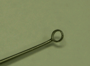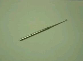The Billeau ear loop (Figure 3) is a metal rod with a small wire loop at the end. The Billeau ear loop is available in small, medium, or large sizes. The small Billeau ear loop is approximately the same size as a size 0 Buck curette, whereas the large Billeau ear loop is approximately the same size as a size 4 Buck curette. This instrument is also available in a disposable form, although only in one size.