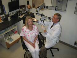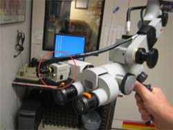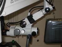 Figure 6 shows a microscope with a small video camera mounted on the microscope. The video-cam can be attached to a DVR, S-Video, and/or simple video equipment. The video box is located on the left so the clinician can manipulate the scope and focus with his or her right hand.