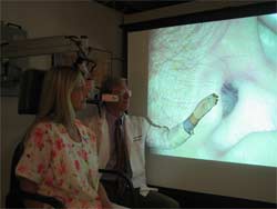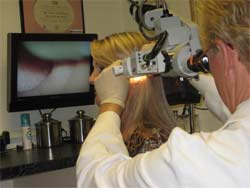 One of the outstanding features of video-otoscopy (VO) is the visual output;such documentation is valuable for patient education and/or referrals (Sullivan, 1997). Similarly, most microscopes can be interfaced with a video camera and attached to a flat screen TV or an LCD projector (Figure 5). In addition to visualizing their canal and tympanic membrane (TM), most patients find watching the actual cermenectomy procedure interesting. This visual allows an audiologist to have the patient look at the screen (see), tell them where in the ear canal they will be touched (tell), and proceed (do) (See-Tell-Do).