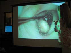 Figure 7 shows a microscope's video output attached to an LCD projector (in this case with S-Video). The individual or student sees the same image observed through the microscope. This has the potential of providing real-life, hands-on instruction when learning safe and effective CM techniques.