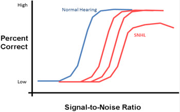 Figure 1. Percent correct on word recognition as a function of signal-to-noise ratio (increasing left to right) for listeners with normal hearing (blue line) versus those with sensorineural hearing loss (red lines).
