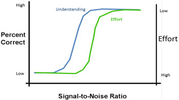 On the right axis, note that effort is graphed with high effort being at the bottom and low effort at the top. There are a range of situations where the person might get some words correct, but still put in a tremendous amount of effort. As the SNR gets better and the word recognition score improves, the person has to put in less and less effort to the point where they will get 100% correct, or plateau at a high level. They may be able to understand every word that is said, but they have to work very hard at doing that. If you further improve the SNR, the amount of effort required for the task starts to lessen. Just because a person is getting 100% correct does not mean they are not working hard to get it. It may be that little improvement to SNR will lessen how much work they have to do to maintain that level of speech understanding.