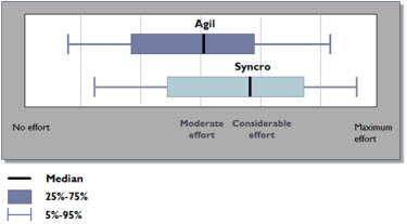 We made a comparison of effort between two different hearing aid models, and we saw patients judge significantly less effort when tested with one hearing aid model over the other (Figure 4). We made another comparison for super-power users of a newer versus older hearing aid. This time the scale range was from 0 to 100 rather than no effort and maximum effort.