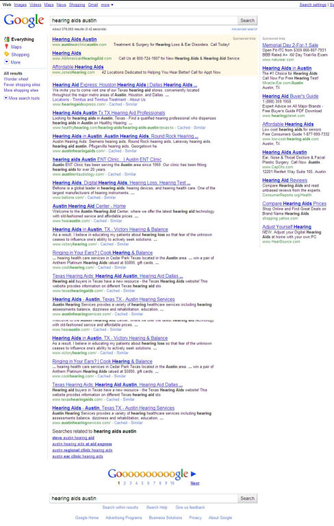 Google, specifically, has been focused on search personalization around local search. I want to explain the evolution of Google over the past few years and share some studies that support this idea as it relates to user activity. Figure 1 is a screen shot of Google from about two or three years ago. I entered the search terms hearing aids Austin.