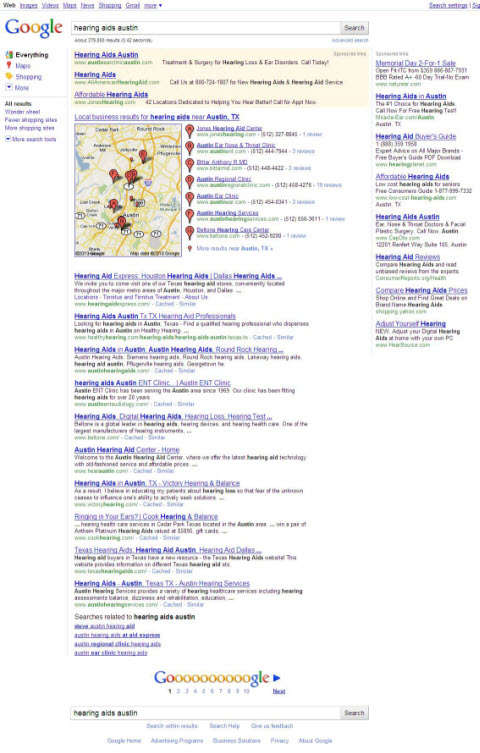 Figure 1. Google search using the words "hearing aids Austin." Click Here for larger view (PDF)