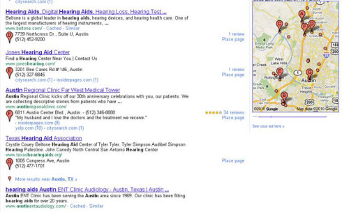 Figure 3. 2011 screen shot of hearing aids Austin search, with mapping feature in the right-hand column, tied to organic Web links in the main body. Click Here for larger view (PDF)