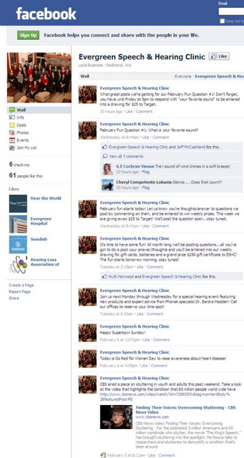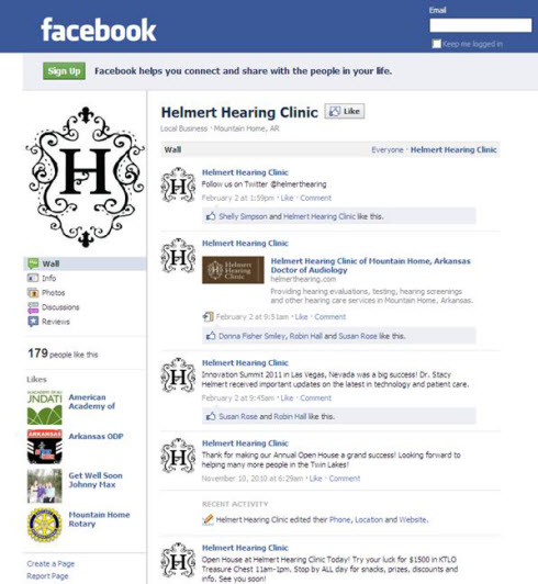 At AudiologyOnline, we are generally recommending to our clients that they set up a Facebook account. It takes five to ten minutes to set up. Once established, you should post updates to your Facebook page just as you would on your Web site. Six years ago I was telling people to absolutely register a domain name. Now I am telling them not only to create a Web presence but a Facebook presence, as well. Although not actually one of our clients, Figure 4 shows an example of a Facebook page for a speech and hearing clinic that includes some good elements. A picture of everyone who is a part of the practice personalizes the page nicely. Every once in a while they post about updates to their clinic. Figure 5 is another example that shows how you can use branding with your logo.