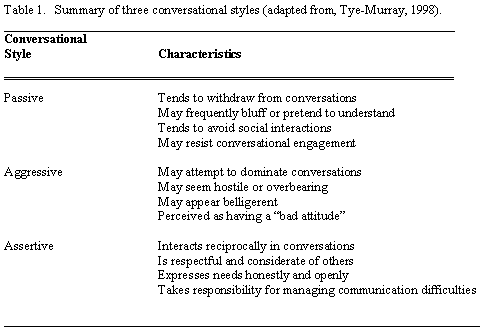 Kaplan, Bally and Garretson (1985) identify three distinct conversational styles, passive, aggressive, and assertive. Table 1 summarizes the relative characteristics of each style as noted by Tye-Murray (1998). It should be recognized that each of these interactional styles produces commensurate listening and speaking behaviors that are unique to each style.