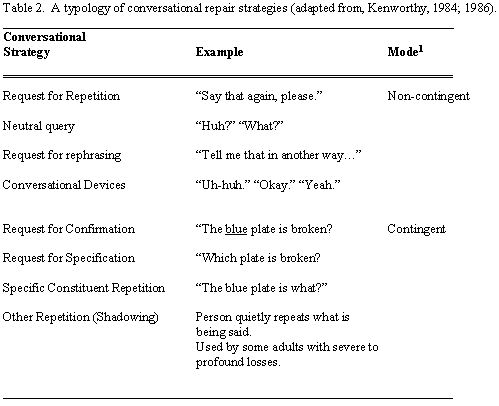 Table 2 summarizes a protocol of conversational repair devices initially developed to study the conversational interactions of children with hearing impairment and their caregivers (Kenworthy, 1984; 1986). Subsequently, this protocol has been successfully applied to adult-adult interactions. It also affords the opportunity to compare results directly with the work of Tye-Murray and others who have examined the conversational strategies of persons with hearing impairment.
