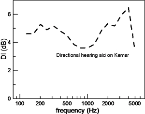 An important metric with respect to directional hearing aids is the "Directivity Index," which is expressed in dB. The Directivity Index (DI) compares sounds originating in front, to sounds originating from all other locations around the hearing aid (Figure 4). The DI might be thought of as the difference in dB from an omni-direction microphone and a directional microphone placed in the exact same diffuse acoustic field (Knowles). The higher the DI number, the more "directional" the response of the hearing aid, and the better the wearer is expected to do in a diffuse noisy environment while wearing the hearing aid. Omni-directional hearing aids will theoretically have a DI value of approximately "0" while an extraordinary directional hearing aid might have a DI that approaches 5 or 6. The theoretical maximum DI for a two-microphone array (or 1st order directional mic) is 6 dB (see Laugesen, personal communication, see Elko, 2000, see Dittberner, 2003)