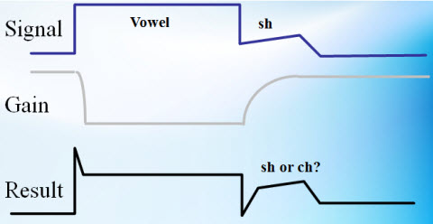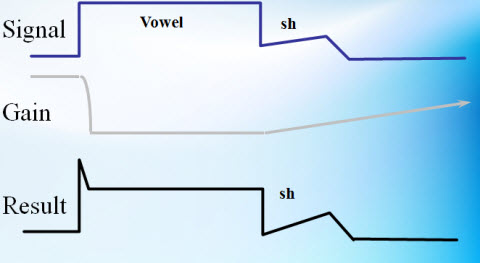 The compression system cannot tell the difference between the closure of a /p/ or the soft /th/ sound and the hissing of an air conditioner. Everything that is soft is going to be amplified by a certain amount of gain. What you get is a loss of definition of the natural amplitude changes in the speech signal (Figure 13).