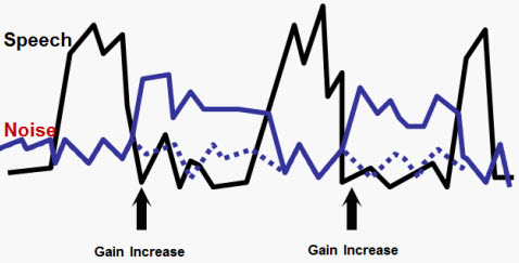 When peaks in speech occur, the noise level is driven down. But in the periods of softer speech or pauses in the speech signal, the speech or the noise level jumps back up. It is an inherent characteristic of a fast-response signal system because of the timing parameters that are used in those systems.