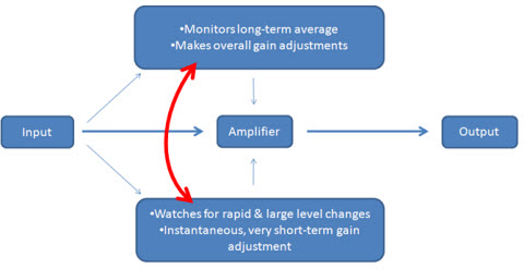 Figure 15. Speech Guard signal processing employed by Oticon. A dual-monitoring compression system processes both long-term speech inputs as well as sudden input changes.