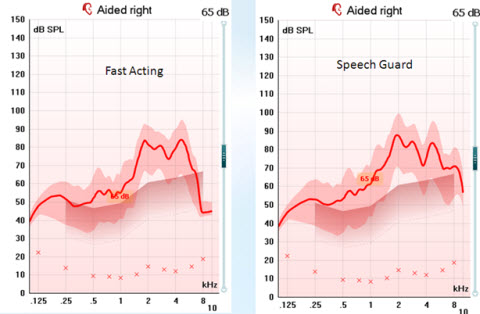 Figure 16. Two hearing instruments set to have the same gain output, with differing compression systems; the left panel is fast-acting compression, and the right panel is the dual-monitoring Speech Guard compression system.