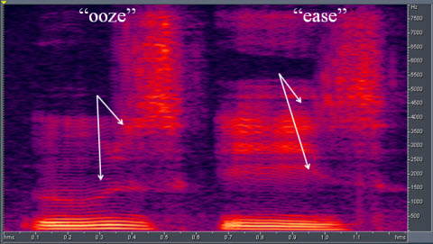 Figure 5. Two words, "ooze" and "ease." White arrows indicate the low second formants followed by the transition time from the initial vowel to the /z/ sound.