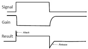 Figure 7. Schematic of attack and release gain with a signal moving quickly from low-intensity input to higher-intensity input.