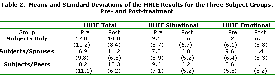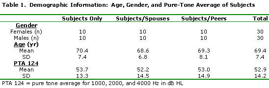 The subjects were assigned to one of six rehabilitation groups: two groups of subjects only; two groups of subjects each with an accompanying spouse; and two groups of subjects each with an accompanying peer. Five males subjects and five female subjects participated in each group. Prefitting and 3-week postfitting HHIE scores, and variables such as age and degree of hearing loss were balanced across the subject groups (Table 1).