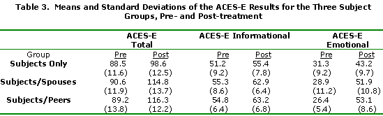 Table 3 contains information pertinent to ACES-E. The one-way analysis of variance indicated significance for total, emotional, and informational components (F's = 6.75, 6.95, and 7.00 respectively, p's