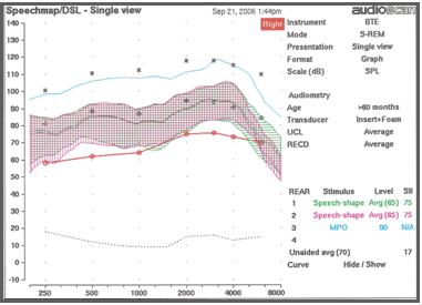 When we first began using this procedure, we did so a bit reluctantly because we had no way, clinically, of testing whether the procedure worked as it should. That is, when adjusting the FM and hearing instrument for transparency with a 65 dB SPL input signal, how could we know that a +10 dB FM advantage programmed into the receiver would occur when there was a higher input into the FM microphone? Rainer Platz at Phonak addressed this concern using laboratory measures which allowed simultaneous and sequential inputs to both the FM and hearing instrument microphones. Results of his measurements are available for download from the Phonak website (Platz, 2006). To summarize, his results showed that, for the Phonak programmable receivers, when the FM level was set to +10 dB, the difference in output for simultaneous inputs to the FM (80 dB SPL) and hearing instrument (65 dB SPL) microphones, once any FM offset had been accounted for, was 10 dB. It should be noted that similar testing has not been completed with FM systems from other manufacturers.
