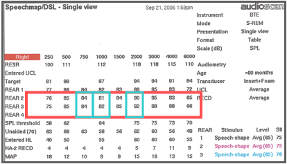 Figure 3. Table view of the above FM offset verification using Audioscan Verifit™ (version 2.4.27). REAR 2 is from the hearing instrument measurement, and REAR 3 is from the FM system measurement. - Subtract the hearing-instrument average from the FM average. If the difference is>+2 dB, change the FM setting as appropriate and re-evaluate.