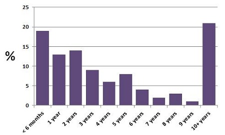 What you notice is a tremendously bimodal distribution. In other words, it is not that bell curve that we expected, but rather a large portion of the distribution is within the first couple of years, and then again at ten years and beyond where they actually decide to go to have their hearing evaluated. They might not necessarily get hearing aids at this point, but at least they entered the process.